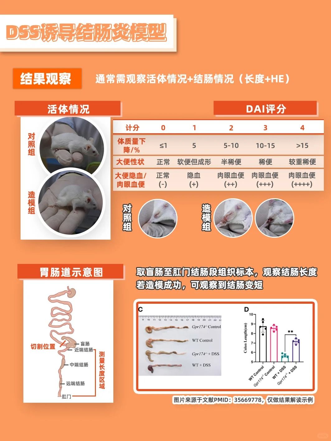 ⒉通過疾病活動(dòng)指數(shù)(DAI)評(píng)分、結(jié)腸長度測量、病理組織學(xué)檢查等指標(biāo)來評(píng)估模型的成功與否以及炎癥的嚴(yán)重程度。