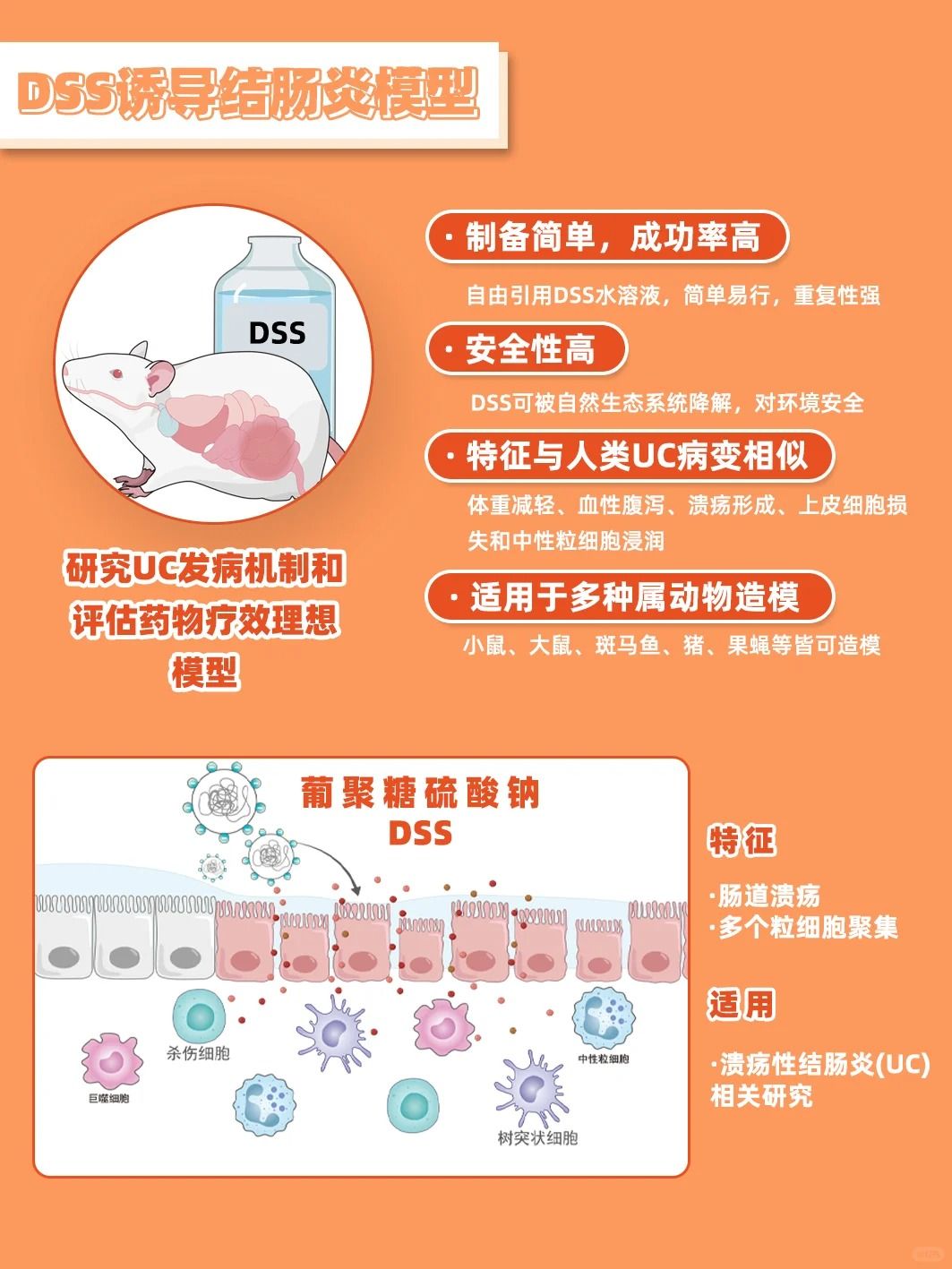 ?▲化學(xué)誘導(dǎo)模型?:如葡聚糖硫酸鈉(DSS)誘導(dǎo)的腸炎模型,廣泛應(yīng)用于炎癥性腸?。↖BD)的研究。