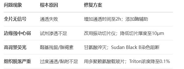 →通透不足:組織致密結(jié)構(gòu)阻礙試劑滲透,深部細(xì)胞標(biāo)記失敗