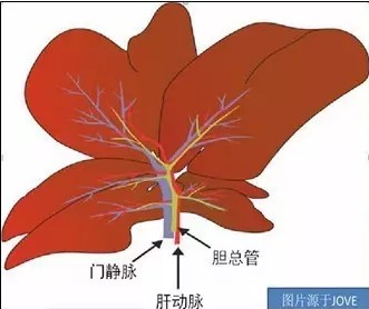 (5)棉簽沾生理鹽水撥開肝臟、腸、胰等臟器,在肝臟底部尋找并暴露出膽管(大鼠沒有膽囊,在肝臟和十二指腸中間找,小鼠沿著膽囊和十二指腸找),膽管下可看到門靜脈血管,與門靜脈血管平行的透明黃色的為膽管。