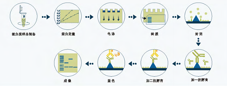 蛋白質(zhì)提取 -> 蛋白質(zhì)分離 -> 轉(zhuǎn)移 -> 阻斷 -> 一次抗體孵育 -> 二次抗體孵育 -> 檢測(cè)