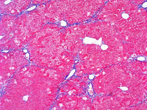 在纖維化組織中,MASSON染色會(huì)呈現(xiàn)出明顯的紅色或紫色區(qū)域。這些區(qū)域代表了膠原纖維的增生和沉積,是纖維化病變的典型表現(xiàn)。通過觀察這些區(qū)域的分布和范圍,可以初步判斷纖維化的程度和范圍。