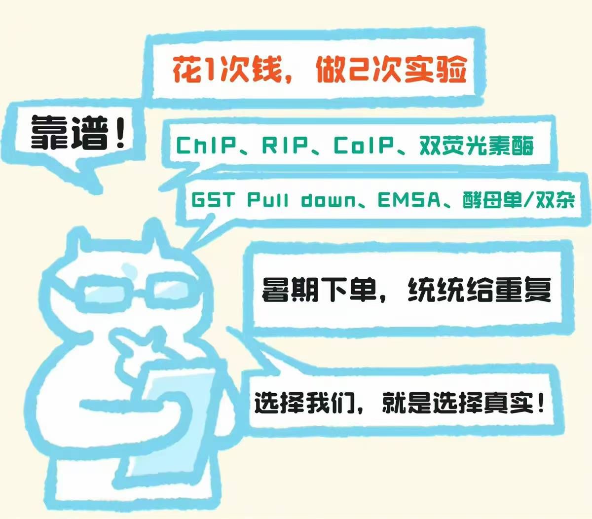 我們深刻理解數(shù)據(jù)可重復(fù)性對科研成果的重要性。本次活動中,所有下單的ChIP、RIP、CoIP、雙熒光素酶、GST Pull down、EMSA、酵母單/雙雜交等實驗服務(wù),都將獲得重復(fù)實驗的特別保障。這意味著: