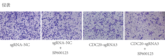 通過Transwell實(shí)驗(yàn)檢測Hela細(xì)胞轉(zhuǎn)染CDC20-sgRNA3或SP600125處理后其侵襲能力的變化。